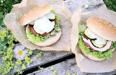 Veģetārais burgers ar grilētiem kabačiem un spinātu – jogurta mērci