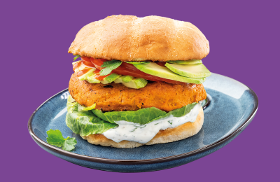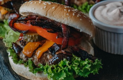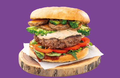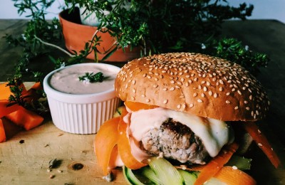 Dārzeņu burgers ar liellopa gaļu un ķiploku – sinepju mērci