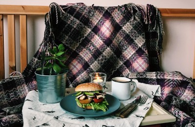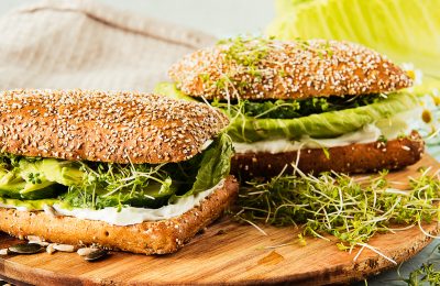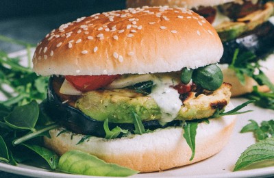 Pavasara burgers ar grilētiem baklažāniem un dīgstu – jogurta mērci