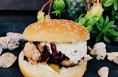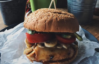 Saldskābais vistas burgers ar ceptiem šampinjoniem