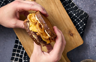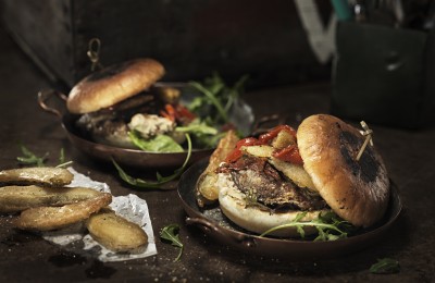 ZIEMAS BURGERS AR KARAMELIZĒTIEM SĪPOLIEM UN LIELLOPU GAĻU
