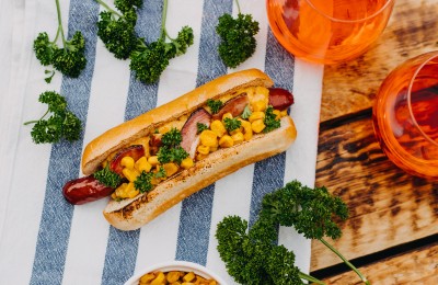 Hotdogs ar vīnes desiņu, siera mērci un bekona gabaliņiem