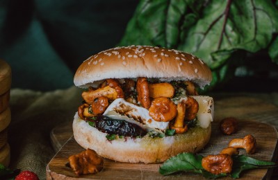 Rudens burgers ar gailenēm un karamelizētām bietēm