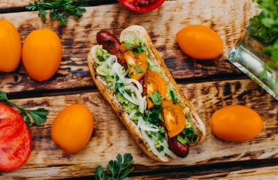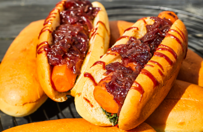 Veģetārais hotdogs ar burkāniem, spinātiem un sīpolu marmelādi