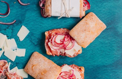 Salami un marinētu sīpolu riku maizīte