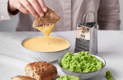 Sēklu maizīšu uzkoda ar siera mērci un zaļo zirnīšu pastēti