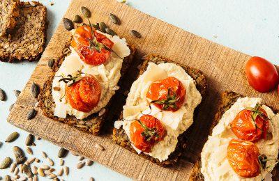 Sēklu maizītes ar humusu un krāsnī ceptiem tomātiem