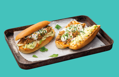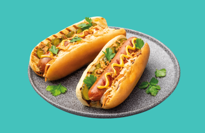Plucinātās cūkgaļas hotdogs