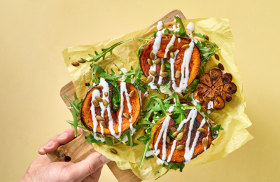 Atvērtā sviestmaize ar ceptu ķirbi
