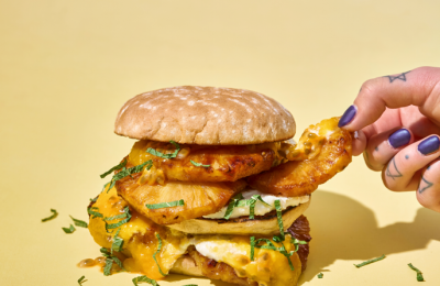 Burgeri ar grilētiem ananasiem un saldo biezpienu