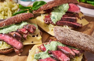 Steika sviestmaize ar pesto un grilētiem dārzeņiem