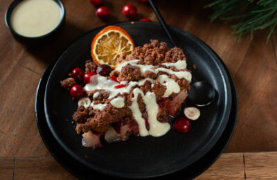 Bumbieru, dzērveņu un piparkūku krambls ar vaniļas mērci