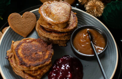Piparkūku pankūkas ar sāļo karameli un brūkleņu ievārījumu