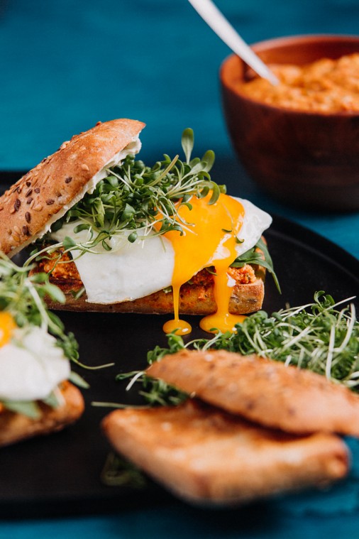 - Uz maizītes apakšējās rikas biezā kārtā klāj romesko mērci, pāri kārto rukolas lapas un šķēlītēs sagrieztu avokado. Pāri liek svaigi izceptu olu un kressalātus vai dīgstus. Uz maizītes augšējās rikas biezā kārtā klāj krēmsieru, to liek pāri jau sagatavotajai maizei.