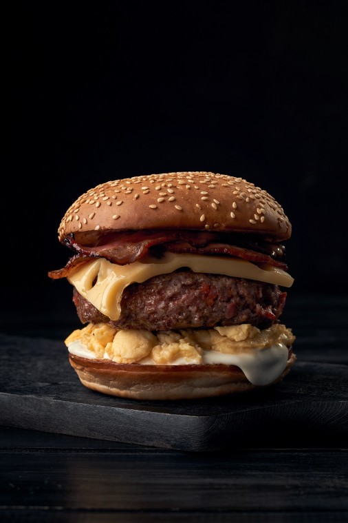 Pagatavo olu kulteni – nelielā katliņā ielej ūdeni (aptuveni 5 cm) un liek vārīties. Metāla bļodā, kas diametrā ir lielāka nekā katliņš (lai ieliekot tā ieguļas, bet nesaskaras ar ūdeni), sakuļ olas ar saldo krējumu un šķipsnu sāls. Kad ūdens vārās, liek bļodu ar olu masu uz katliņa, pievieno 60 g sviesta un, nepārtraukti maisot, karsē, līdz masa ir krēmīga, bet ne slapja. Noliek malā. Kad masa nedaudz atdzisusi, iemaisa trifeļu eļļu. Pagatavo burgeru – gaļu samaisa ar čorizo un sāli, veido 4 vienādas kotletes, saplacina līdz 1,5 cm biezumam un noliek vēsumā. Maizītes apsmērē ar sviestu un karamelizē zeltainas. Pannā vai uz grila apcep bekonu, līdz tas ir gandrīz kraukšķīgs. Gaļu cep 8 minūtes, pēdējās 2 minūtes uzliek sieru, lai tas pārkūst. Gaļu noliek malā uz 4 minūtēm, lai tā atpūšas. Uz apakšējās maizītes kārto majonēzi, tad olu kulteni, tālāk seko gaļa un bekons, visu nosedz ar maizīti.