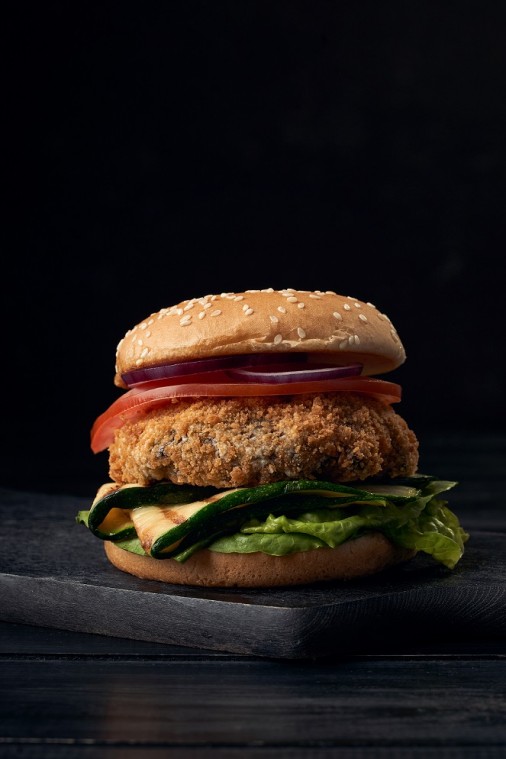 Ar sieru pildītas portobello sēnes, panētas rīvmaizē ar garšaugiem, čili, Parmas sieru; svaigi tomāti, grilēti marinēti cukīni, salātlapas, svaigi sīpoli, sinepju majonēze ar sweet pickle.