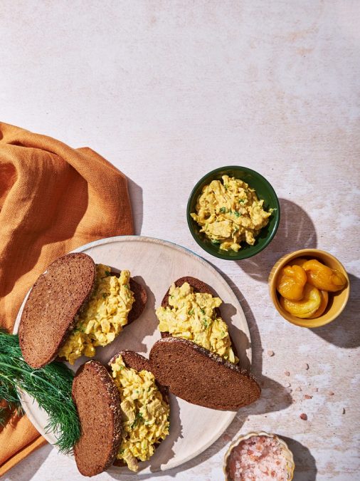 - Pasniedz starp grauzdētas maizes šķēlēm.