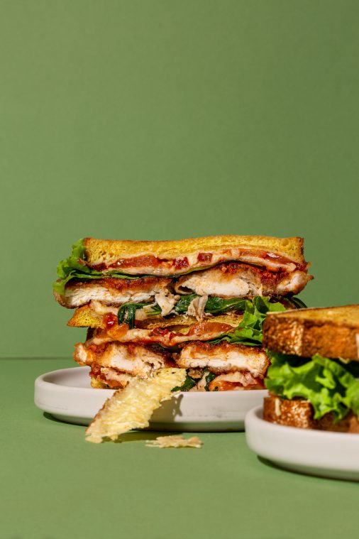 - Tikmēr gatavo kraukšķīgo vistu. Uzkarsē pannā eļļu, sakuļ olu ar oregano, sāli un pipariem. Vienā šķīvī ber miltus, otrā – rīvmaizi, kas samaisīta ar rīvēto sieru. Cāļa fileju liek miltos, tad olā un rīvmaizē ar sieru. Liek cepties sakarsētajā pannā. Cep no abām pusēm. Tai jābūt zeltaini brūnai. Kad maizīte izcepusies un kraukšķīgās filejas arī, uz maizes liek salātu lapiņas, cāļa fileju, kas apsmērēta ar dārzeņu krēmu, pa virsu liek otru maizīti.