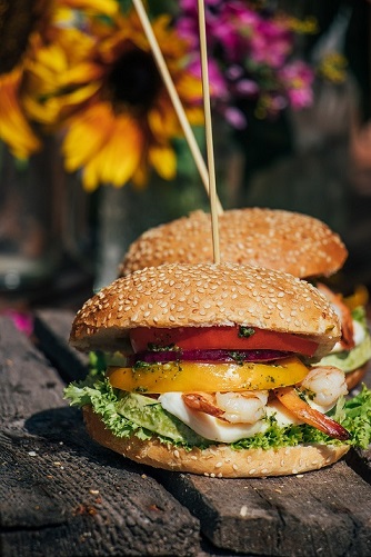 - Gatavo burgeri – liek salātlapu, kabaci, mocarellas sieru, tīģergarneles, tomātu, sīpolu šķēles, pārlej ar mērci un pasniedz. Lai vasarai vasarīgi burgeri!