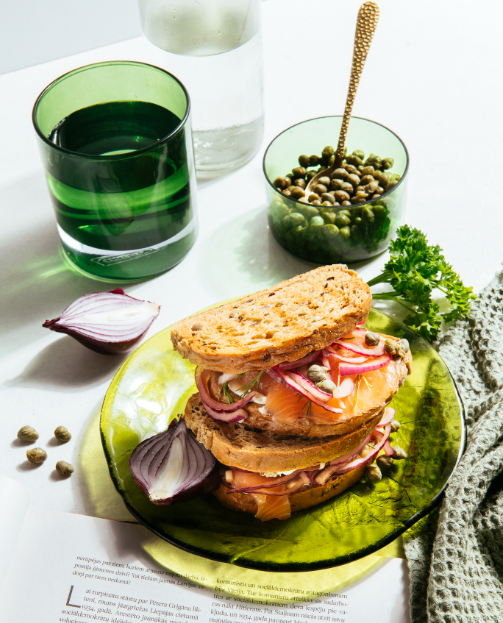 - Mazā trauciņā samaisa krēmsieru ar smalki sakapātiem lociņiem. To smērē uz visām 4 maizes šķēlēm. Pa virsu liek lasi, marinētos sīpolus, pārber ar kaperiem, pa virsu liek otru maizīti.