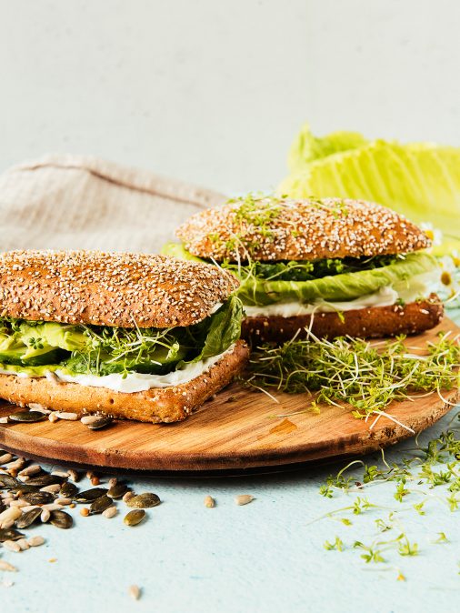 - Maizes rikas iekšpusē noklāj ar kazas sieru. Uz apakšējās rikas kārto romiešu salātlapas, šķēlēs sagrieztus gurķus un avokado šķēles.