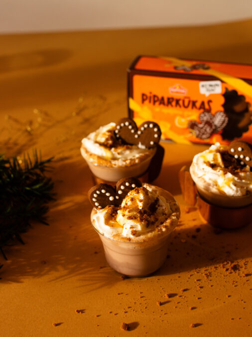 - Silda un puto pienu kopā ar kakao pulveri līdz dzēriens ir silts un ar nelielām putām, pievieno drupinātas piparkūkas un vēlreiz saputo;
