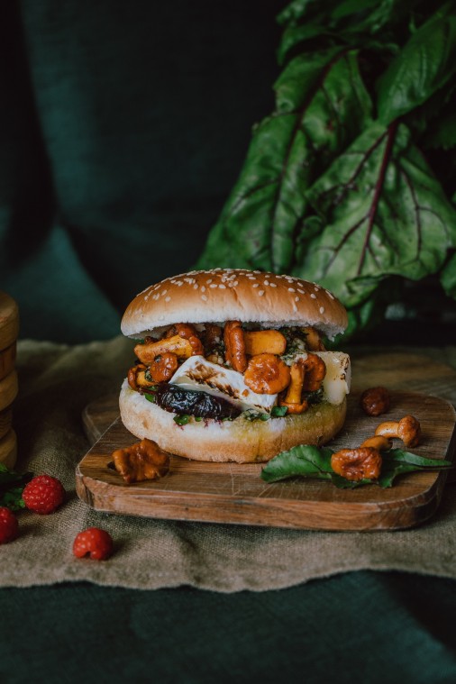 - Gatavo burgeri – liek salātlapu, bietes, gailenes ar brī sieru un pāri lej mērci.