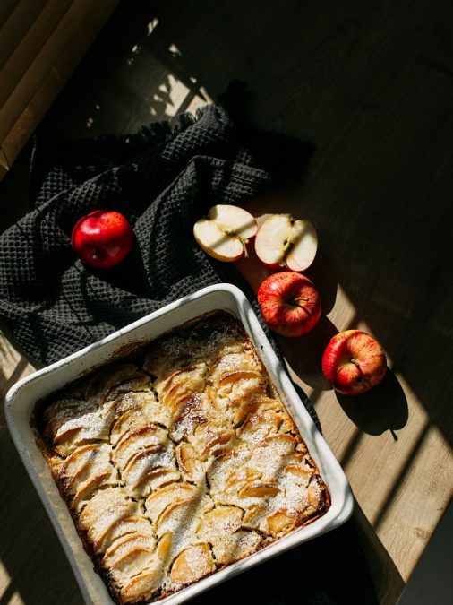 - Daļu krējuma izsmērē uz maizes kārtas. Tad liek plānās šķēlītēs sagrieztus ābolus un pārklej ar atlikušo krējumu.