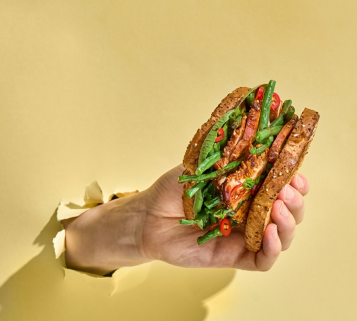 - Kārto maizītes. Apakšējo šķēli pārsmērē ar majonēzi, pārliek ar pakčoja lapām, zaļajām pupiņām, šķēlēs sagrieztu tītara fileju, ko pārber ar smalki sagrieztiem lokiem un sarkanā čili pipara šķēlītēm. Pārliek ar otru šķēli maizes.