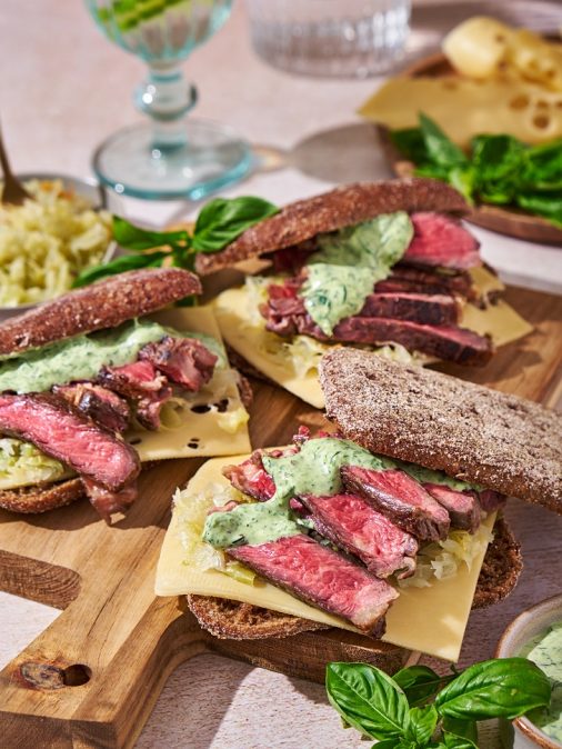 - Apgrauzdē rudzu rikas, un kārto visas sagatavotās sastāvdaļas – mērci, salātlapas, skābētos kāpostus, steiku, sieru.