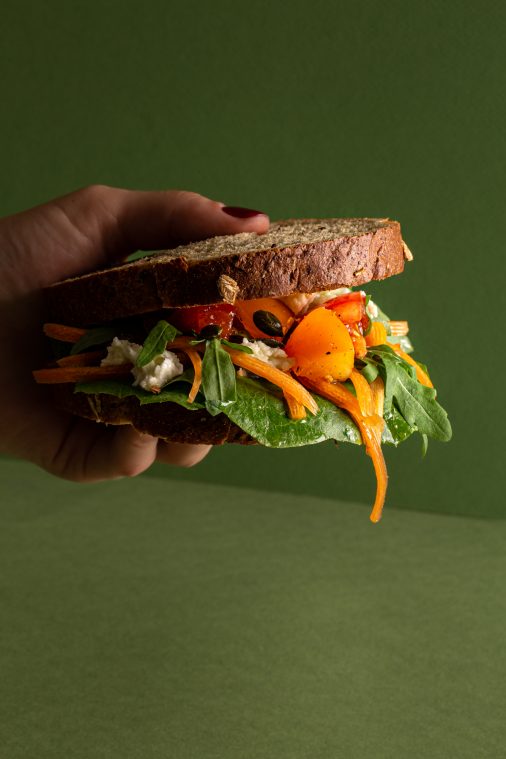 - Liek uz maizītes rukolas lapiņas, burkānu strēmelītes, pa virsu tām kārto tomātus ar baziliku un mocarellas sieru, ķirbju sēkliņas un gurķu strēmelītes. Liek pāri otru maizīti.