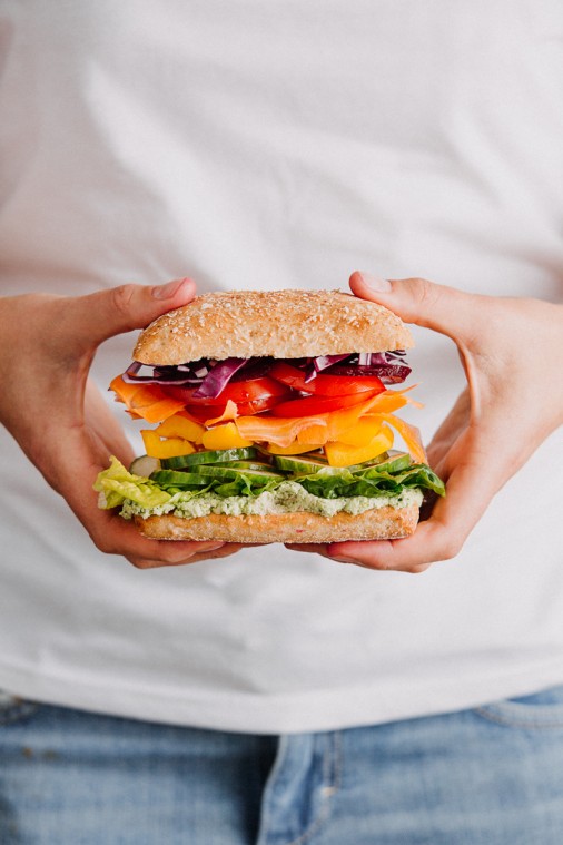 - Uz maizes klāj biezu kārtu vegāniskā krēmsiera, pa virsu kārto pārējās sagatavotās sastāvdaļas, sekojot krāsu pārejai, lai izskatītos glītāk. Te iespējams eksperimentēt ar dārzeņiem un izvēlēties tos, kas katram garšo vislabāk vai izlaist tos, kas pie sirds īsti neiet. Lielisks veids, kā papildināt ēdienkarti ar dažādiem dārzeņiem.