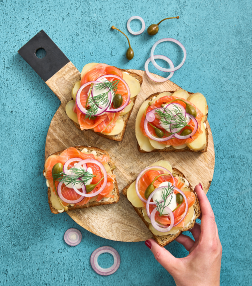 - Maizes šķēles pārsmērē ar majonēzi, pāri kārto vārītu un atdzesētu kartupeļu šķēles un kūpinātu foreli.